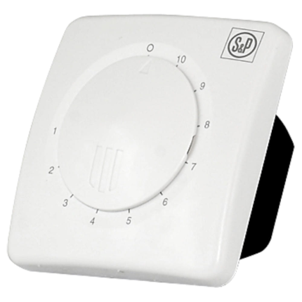 The Soler&Palau REB-2.5 NE is a flush-mounted electronic single-phase fan speed controller designed for installation in a standard in-wall electrical box. Equipped with a single rotary knob for ON/OFF switching and smooth speed adjustment, it includes a minimum speed calibration feature that ensures accurate, stable and energy-efficient control of fan motor speed in residential and commercial ventilation systems.