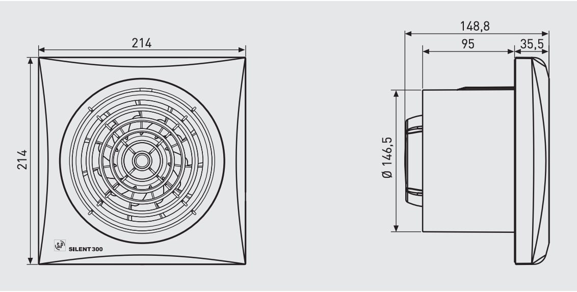 Motor mounted on silent-elastic-blocks which absorb the vibrations and allow offering very low noise level. Manufactured from injection moulded plastic, fitted with automatic shutter and single phase 230V-50Hz, class B low consumption motor equipped with thermal overload protection. All SILENT 300 series fans are class II insulation, IP45 rated and suitable to operate with air temperature up to 40ºC